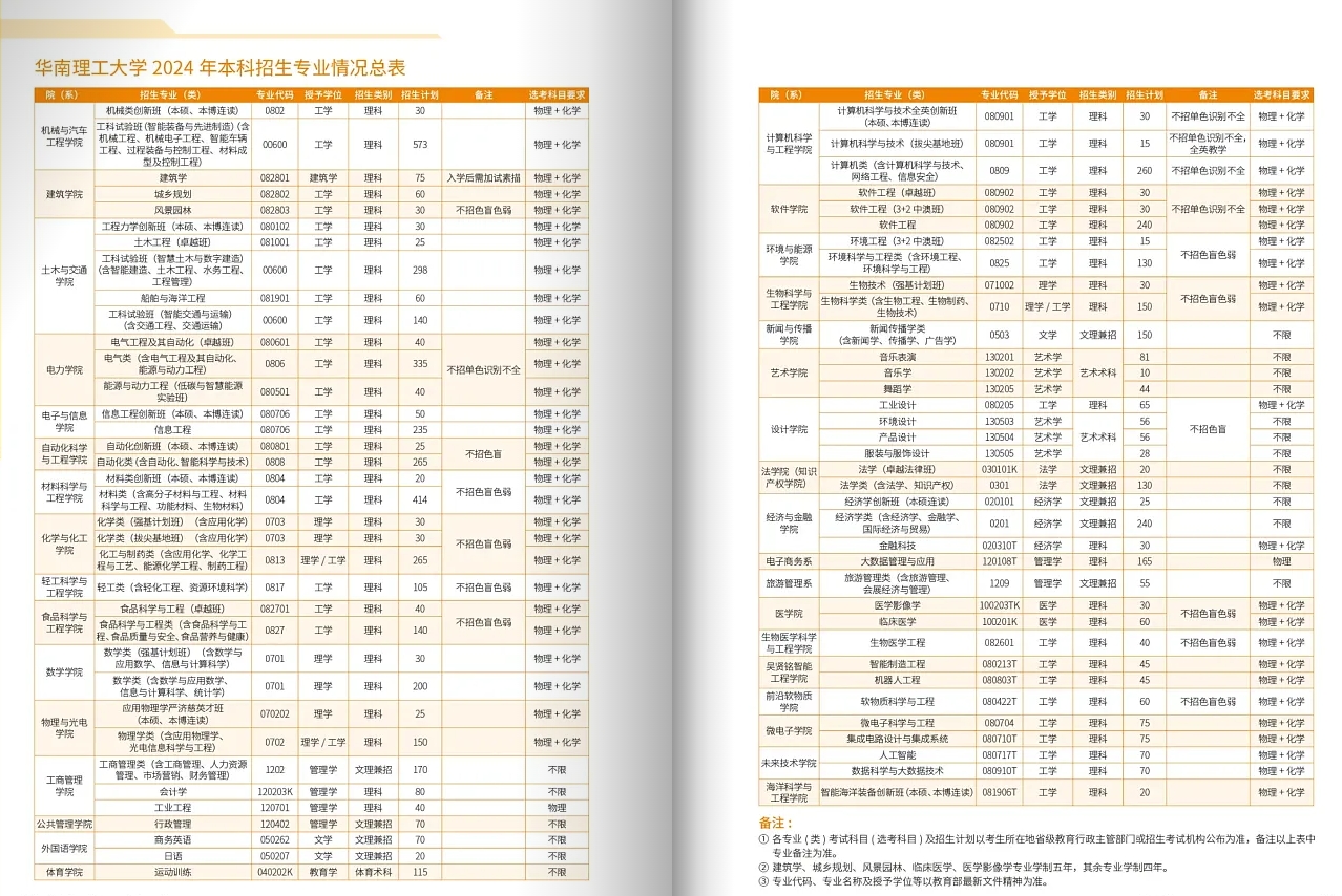 今年华工本科招生总规模是7000人,包括强基计划、综合评价、普通类、国家专项、高校专项等多个招生类型。其中,在广东省计划招生3500余人。招生专业(类)包括19个专业类,31个专业,22个教学改革班。 华工今年优化专业结构,增加报考热度高的专业计划,新增“智能海洋装备”“软物质科学与工程” “能源与动力工程(低碳与智慧能源试验班)”“统计学”“工业工程”5个专业招生,升级交通运输类专业为“工科试验班(智能交通与运输)”。 志愿录取原则: 填报华工志愿服从调剂且符合录取要求,不退档;专业志愿填报无分数级差;投档和安排专业时以高考投档成绩为准,承认符合教育部政策的加分。 建筑学、城乡规划、风景园林、临床医学、医学影像学等专业(五年学制)不报不调剂,其中城乡规划和风景园林专业入校后无需加试素描;软件工程(中澳班)、环境工程(中澳班)等不报不调剂。 针对广东省考生,所有专业组推出了零调剂志愿保障计划。华工将继续实施专业志愿“非常6+1”,在专业组内报满6个不同专业(类)且服从调剂者,均可在专业组内选择一个非意向专业。 第一章 总则 第一条 依据《中华人民共和国教育法》《中华人民共和国高等教育法》等相关法律、教育部相关规定和《华南理工大学章程》,结合华南理工大学本科招生工作实际,制定本章程。 第二条 华南理工大学招生工作遵循严格程序、公平竞争、公正选拔、公开透明,以考生高考成绩为主要依据,德智体美劳等方面全面衡量、综合评价、择优录取。 第三条 华南理工大学招生工作接受纪检监察部门、考生、家长及社会各界的监督。 第二章 学校概况 第四条 学校中文名称为华南理工大学,简称华南理工;英文名称为South China University of Technology,英文缩写为SCUT。 第五条 学校是教育部直属、国家“双一流”建设高校,办学类型为国有公办,办学层次包括本科生、硕士研究生、博士研究生。 第六条 学校设有五山校区、大学城校区、广州国际校区,地址分别为广州市天河区五山路381号、广州市番禺区广州大学城外环东路382号、广州市番禺区兴业大道东777号。 第七条 具有华南理工大学学籍的学生,在规定年限内达到所在专业毕业要求者,颁发华南理工大学本科毕业证书;符合学位授予条件者,颁发普通高等教育本科毕业生学士学位证书。 第三章 组织机构及职责 第八条 学校招生工作领导小组全面负责全校本科招生工作。 第九条 学校招生办公室是常设工作机构,负责学校本科招生日常工作。 第十条 纪委办公室、监察处对本科招生工作实施再监督,负责对涉嫌违纪违规行为进行调查处置。 第四章 计划与录取 第十一条 学校依据国家相关政策指导,结合本校实际情况,统筹考虑各省(自治区、直辖市,下同)教育发展状况、生源质量、区域协调发展等因素,参考近年来本校招生来源计划编制、实际生源情况、毕业生就业质量和去向等统计分析,编制当年本科分省分专业招生计划,由各省级招生考试机构向社会公布。 第十二条 学校将招生计划总数的1%作为预留计划,主要用于调节各地统考上线生源的不平衡及解决同分数考生的录取等。预留计划的使用坚持质量优先、统筹安排、严格规范的原则。 第十三条 考生档案必须齐全、真实,对不符合规定的档案材料,可要求予以补充或退档。政治思想品德考核不合格者不予录取。 第十四条 学校原则上执行教育部、原卫生部、中国残疾人联合会颁发的《普通高等学校招生体检工作指导意见》和人力资源和社会保障部、教育部、卫生部《关于进一步规范入学和就业体检项目维护乙肝表面抗原携带者入学和就业权利的通知》等有关要求。身体健康状况具体要求按照《华南理工大学2024年本科招生专业情况总表》执行,体检不合格者不予录取。新生入学后进行体检复查(色盲、色弱等色觉评定以高考体检结果为准),复查不合格者,取消入学资格或按学校有关规定处理。 第十五条 学校根据国家有关政策指导,结合本校实际情况确定学业水平考试要求及各省选考科目要求,报教育部备案后由各省级招生考试机构向社会公布。 第十六条 录取至建筑学专业的考生,入校后需加试素描。素描成绩不合格者参照学校当年各专业在生源地录取分数线及考生高考志愿,依据高考投档成绩,按照高分转低分的原则结合录取要求,调入新专业。 第十七条 学校本科外语教学中,非外语类专业主要采用英语教学,本科生英语水平必须达到学校的培养要求方可毕业。非英语语种的考生应慎重填报。 第十八条 学校根据生源省招生计划数,结合生源分布情况,与省级招生考试机构协商确定调阅考生档案的比例。按照顺序志愿投档的批次,原则上控制在各省公布招生计划数的120%以内;按照平行志愿投档的批次,原则上控制在各省公布招生计划数的105%以内。平行志愿批次普通类考生调档后,服从调剂且符合专业录取要求者不退档;未完成计划采取征集志愿完成。非平行志愿批次优先录取第一志愿考生,若第一志愿档案不足,依次按院校志愿顺序从高分到低分录取考生,其专业志愿只能录取到学校前一志愿录取后未满额的专业。 第十九条 学校承认各省级招生考试机构认定符合教育部加分政策的考生的高考投档成绩,最高加分不超过20分。学校在录取时对获得各类政策性加分的考生不作累