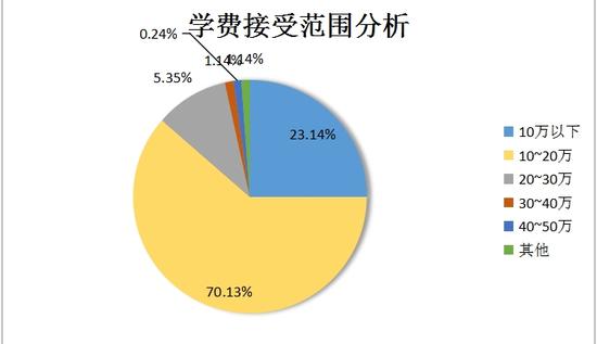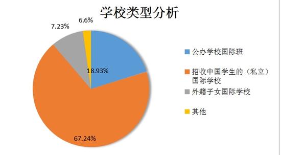 北京优质而丰富的国际学校教育资源不仅吸引生活工作在北京的京籍家长和非京籍家长,也吸引了周边地区如天津、河北、内蒙古等北方地区的家长的关注,家长们为了给孩子提供最优质的国际教育也不惜从外地来到北京。 某教育在去年举办的国际学校择校巡展活动中,共有近6000名家长参加,有一半以上是北京地区家长,占比 69.7%,北京周边天津、河北、内蒙古等北方地区的家长也占有较大比例,为24.9%,同时还有一部分其他地区家长(5.4%)。 1、孩子是否中国籍 孩子国籍分析 分析: 这次参展的家庭中,83.27%家庭的孩子是中国籍,选择国际学校是为出国留学做准备,提前适应国际教育。同时,16.73%的家庭孩子是外籍、港澳台等身份。 2、选择哪种类型学校 学校类型分析 分析: 根据调查数据,67.24%的家长倾向于招收中国学生的私立国际学校,还有18.93%的家长希望孩子能读公办学校的国际班,少数外籍家庭的家长想送孩子就读外籍子女国际学校(7.23%)。 3、学费接受范围 学费接受范围 分析: 根据家长对学费的接受范围的调查发现,大多数家长对于10~20万/年的学费比较能够接受,这部分家长占比70.13%,这跟参展学校的实际学费的统计相比较,是较为匹配的,同时还有23.14%的家长希望选择每年10万以下的国际学校。 4、家长关注热点 关注热点分析 分析: 在某浪国际学校择校展中,对家长的关注热点做统计后发现,家长首要关心的是孩子高中毕业后的去向问题,占比28.3%,其次家长对学校的收费标准(22.8%),课程设置(20.2%),户籍要求(15.7%)都有不同程度的关注,在明确以上问题后,部分家长还对学校的师资力量(9.8%)和基础设施(3.2%)有所关注。